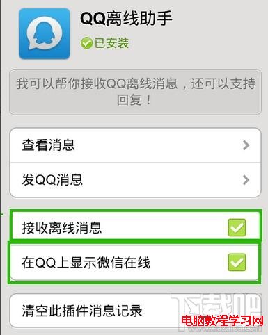 7、點擊“QQ離線助手”以後,進入到設置窗口,再窗口上面把QQ離線助手裡的“接收離線消息”和“在QQ上顯示微信在線”選中,這樣微信就和QQ號同步了;