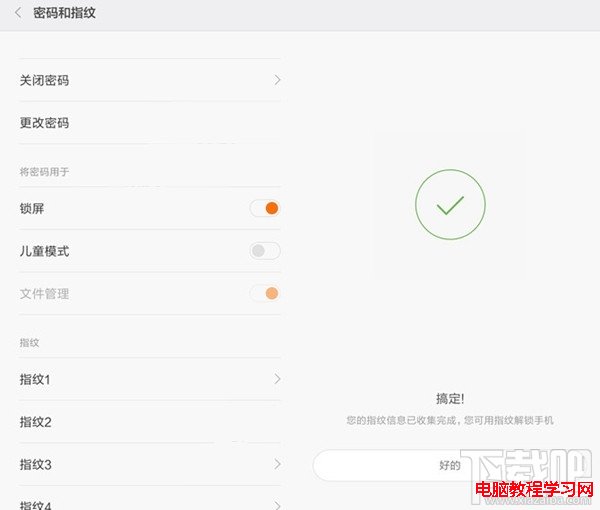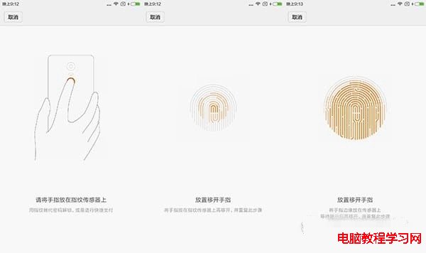 2、在設置頁面中,再點擊進入【鎖屏、密碼和指紋】界面,然後按系統提示設置好四位數字密碼之後,接下來就可以為紅米Note3添加指紋了。跟目前市面上絕大多數指紋手機一樣,添加指紋方法很簡單,只需按照提示來便可。整個過程無非就是反反復復的把手指放置在紅米Note3機身背面的指紋感應器上,然後抬起,就是這樣的反反復復幾次就完成一次指紋錄入,如下圖所示。