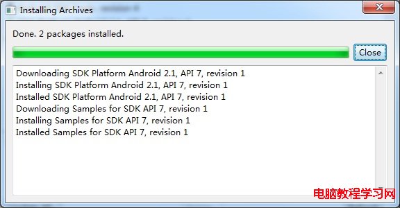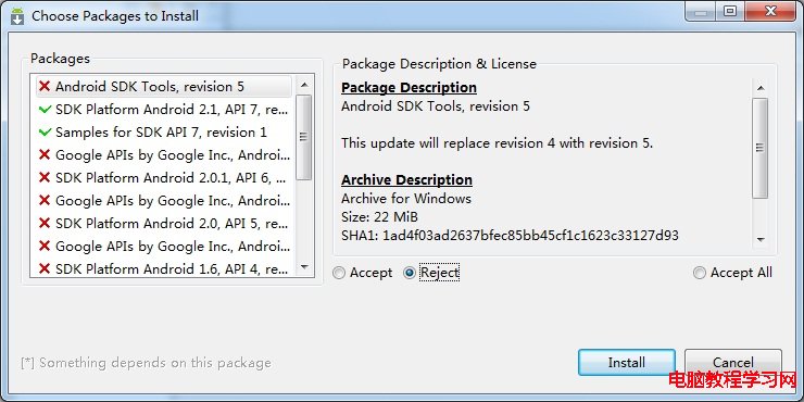 選擇左邊的某一項,點擊accept表示安裝,點擊reject表示不安裝,我這裡只選了SDK 2.1 和samples for api 7 , 自己可以任意自定義,確定後,選擇install按鈕,進入安裝界面如下: