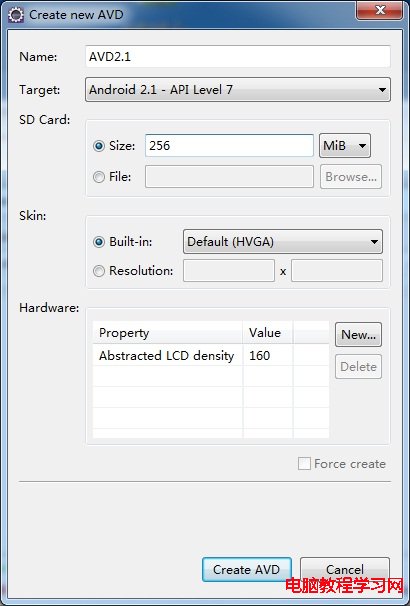 (3)新建AVD(android vitural device) 和上面一樣,進入android sdk and avd manager,選中Vitural Devices 在點擊New按鈕