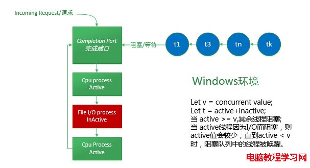 當活動線程的數量 v >= c,就將其它關聯在完成端口上的線程阻塞,直到活動線程的數量 v < c.