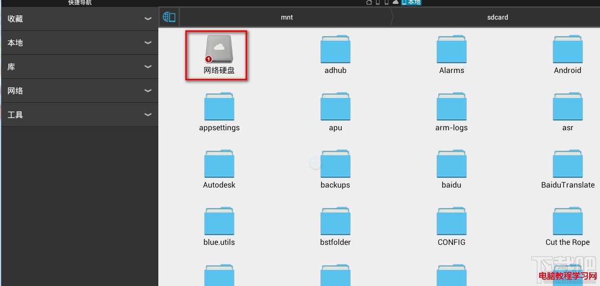 1:進入ES文件浏覽器,首次會進入sdcard目錄,第一個就是它的雲功能,如果您沒有將雲綁定,那麼就會顯示為灰色,選擇他進入網盤綁定的環節,這裡綁定的是ES文件浏覽器所說的私有雲,是百度雲盤提供的。