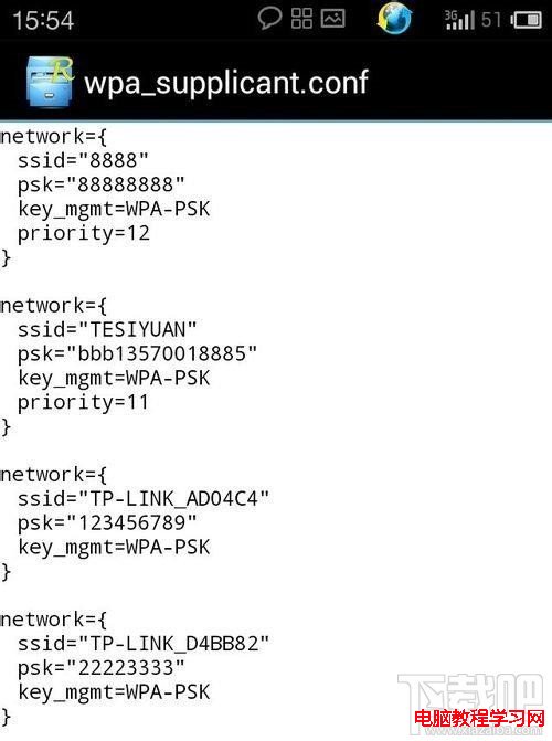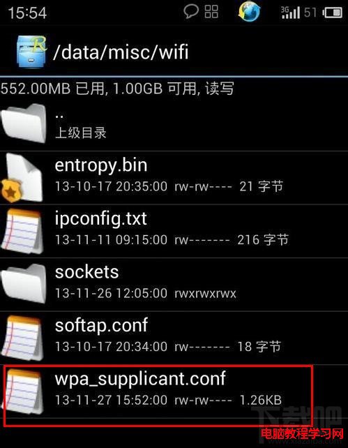 3、安裝Root Exploere(RE管理器),下載地址:http://www.xiazaiba.com/html/4549.html,打開Root Exploere(RE管理器),進入data/misc/wifi,目錄裡有個wpa_supplicant.conf或者其他文件名以.conf結尾的文件,所有手機記住的wifi密碼都在這個文件裡。