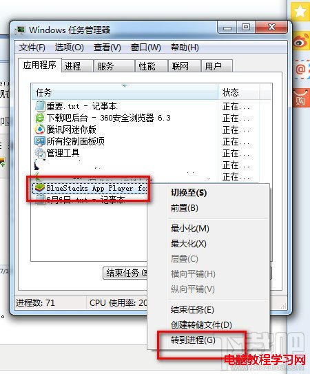 2:在任務管理器裡,鼠標右鍵點擊BlueStacks選擇“轉到進程"。