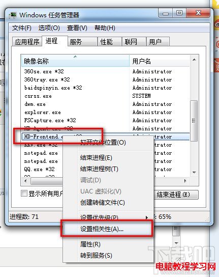 3:在轉到的HD-Frontend.exe上,點擊鼠標右鍵,選擇設置相關性(裡面是CPU內核選擇,選擇最後一個,其他的留空。)