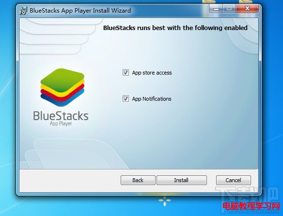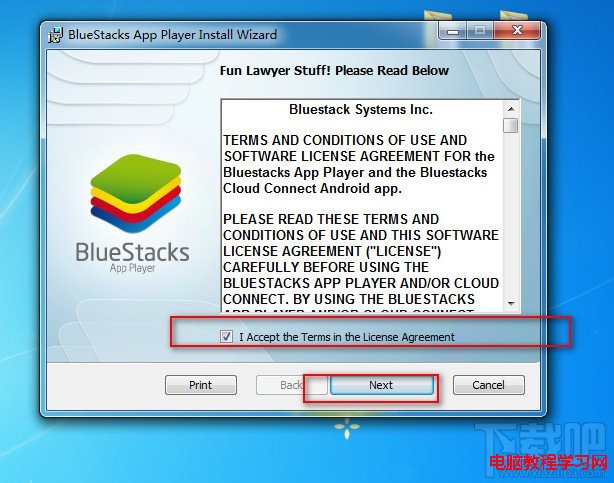 1:先在下載吧網站上搜索BlueStacks這個軟件,下載下來,然後雙擊運行,就開始安裝,要勾紅色框裡面的資料,才能選擇繼續。