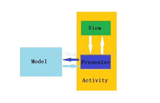 當將架構改為MVP以後,Presenter的出現,將Actvity視為View層,Presenter負責完成View層與Model層的交互。現在是這樣的: