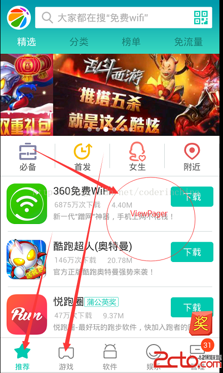 最近項目中,有個需求就是要禁止ViewPager滑動事件,我們看下360手機助手的界面,風格就類似這樣的 大家如果使用過360手機助手就會
