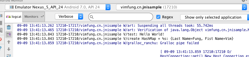 Log.v("create HashMap = %s", jniUtil.createHashMap("Fist Name", "Vim", "Last Name", "Fung").toString());