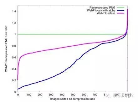 下圖是選取了1000張網絡中的PNG,對其進行壓縮後,與對應的無損WebP以及有損帶透明WebP比較。可見絕大部分圖片經過兩種WebP壓縮後均比PNG要小。