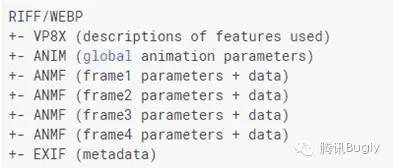 動態WebP的原理與GIF和APNG原理類似,每一幀記錄變化區域的坐標、長寬、播放延時等用於還原並播放。