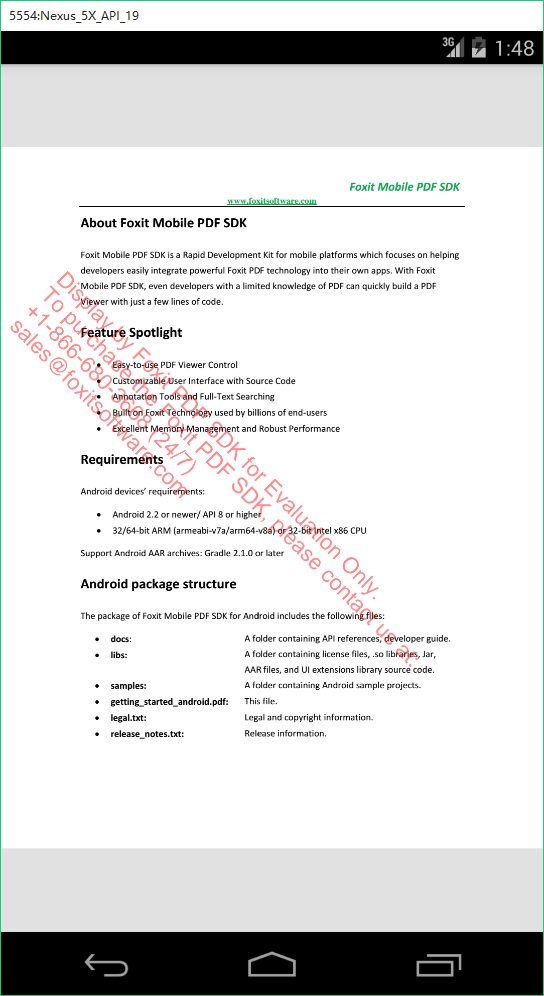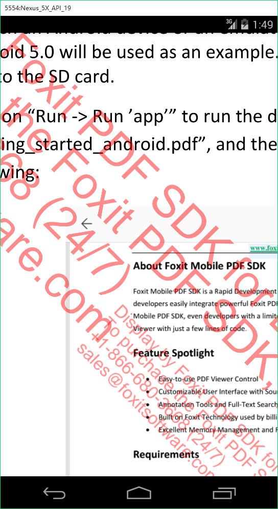 PS: 我們是要渲染顯示一個PDF文檔,因此需要事先將文檔放到真機或者模擬器中。這裡我還是用getting_started_android.pdf文檔(太懶了,直接用現成的)。如果你不知道怎麼添加文檔,請參考第一篇Foxit Mobile PDF SDK for Android_初始(1)。