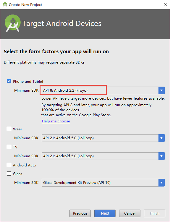 選擇在”Phone and Tablet”上來跑該app. 最低的SDK版本選擇:API 8: Android 2.2. 這樣基本可以支持所有的android設備。點擊Next.