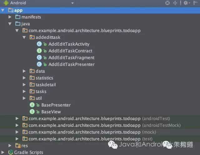 從上圖中可以看出,項目整體包含了一個app src目錄,四個測試目錄。在src目錄下面對代碼的組織方式是按照功能進行劃分。在這個項目中包含了四個功能,它們分別是:任務的添加編輯(addedittask),任務完成情況的統計(statistics),任務的詳情(taskdetail),任務列表的顯示(tasks)。對於data包它是項目中的數據源,執行數據庫的讀寫,網絡的請求操作都存放在該包內,也是MVP架構中的Model層。而util包下面則是存放一些項目中使用到的工具類。在最外層存放了兩接口BasePresenter和BaseView。它們是Presenter層接口和View層接口的基類,項目中所有的Presenter接口和View層接口都繼承自這兩個接口。