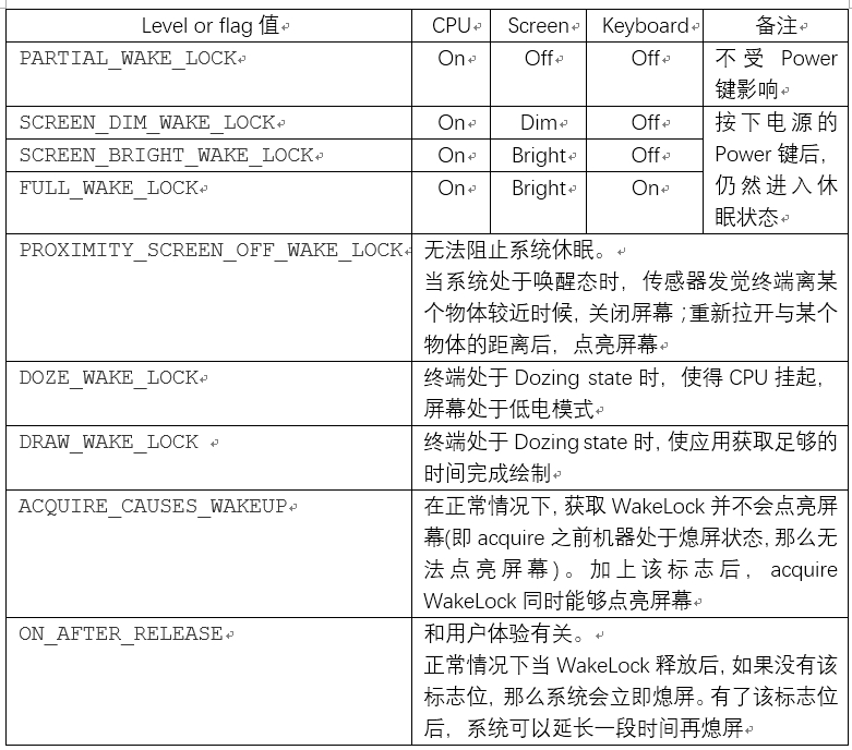 目前,在PowerManger中一共為WakeLock定義了7種level。