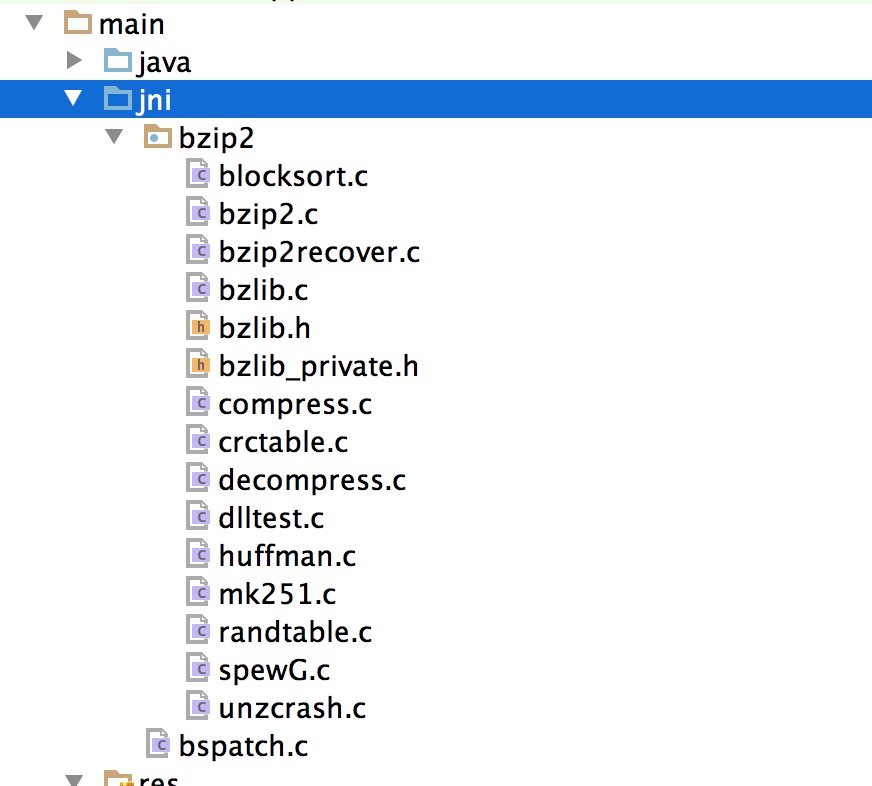 那麼到這裡,我們就完成了JNI的編寫,當然文件是bsdiff提供的c源碼。