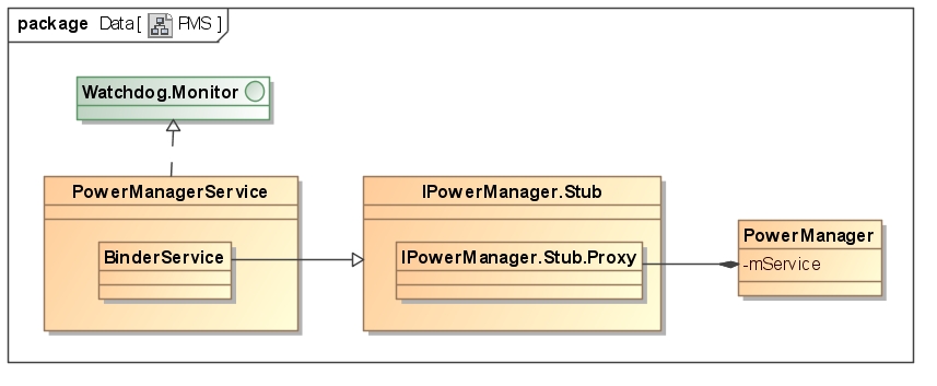 如上圖所示,可以看出PMS的對外接口是PowerManager,其通過Binder通信來調用PMS中定義的BinderService的接口。