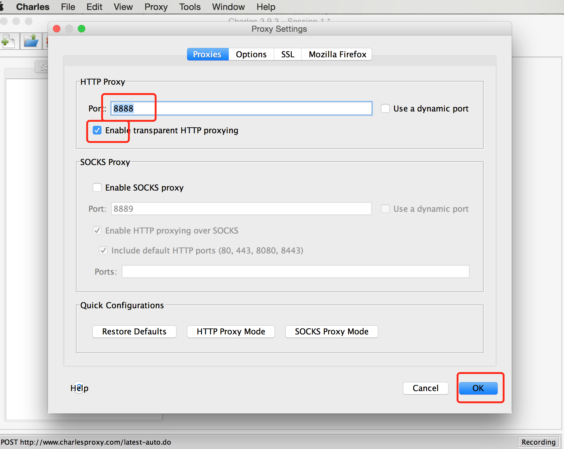 菜單欄Proxy -> Proxy settings,Port設置一個不與電腦其他端口沖突的端口號,比如8888,並勾選Enable transparent HTTP proxying,點擊OK。如圖