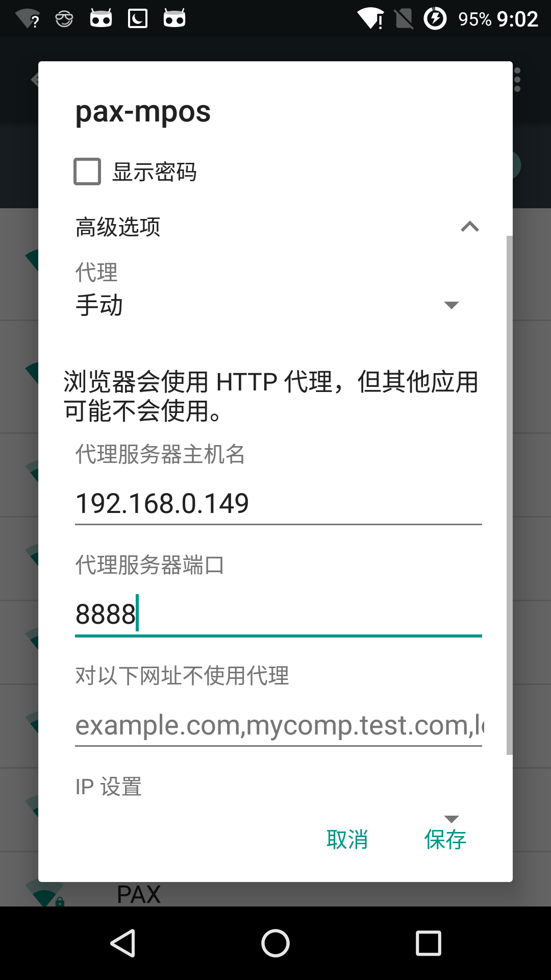 然後,Android或iOS須和主機處於同一個局域網下(連同一個路由器,同網段)。在Android中打開設置->WLAN->長按當前連接的Wifi->修改網絡->高級選項->打開代理(手動)->輸入主機ip地址及代理端口號->保存,如圖