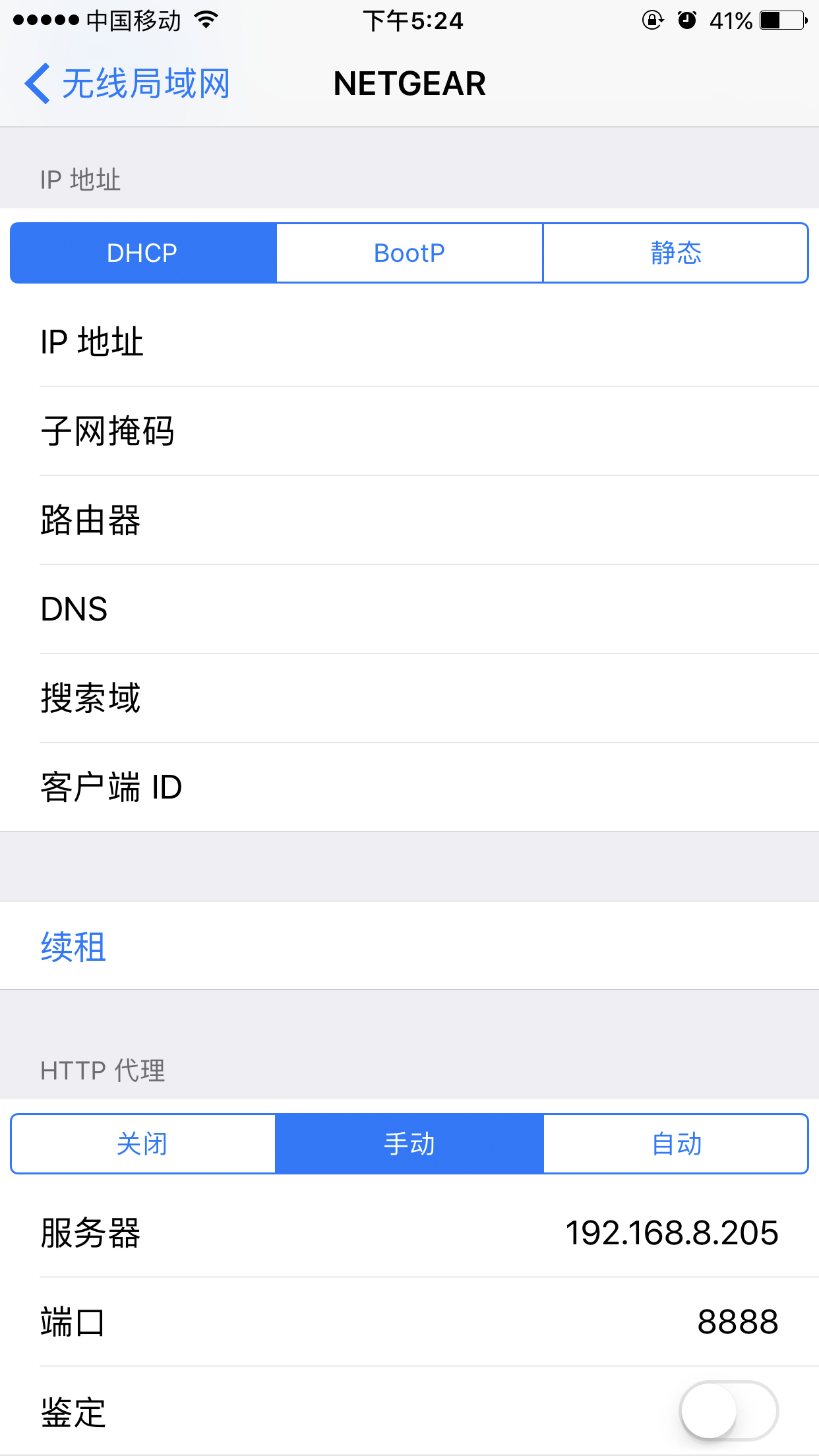 iOS開啟代理的方式也差不多,進入設置->無線局域網-> 查看當前連接的Wifi信息->HTTP設置服務器和端口。如圖