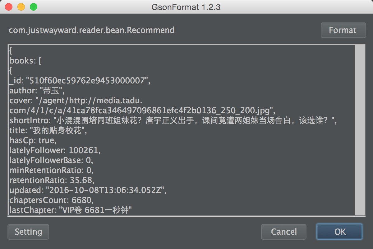 可以通過抓包得到的json數據,來生成一個實體類。那麼如果json字段特別多呢?Android Studio提供了一個GsonFormat插件,可以快速的把json數據轉換成Java Bean。如圖: