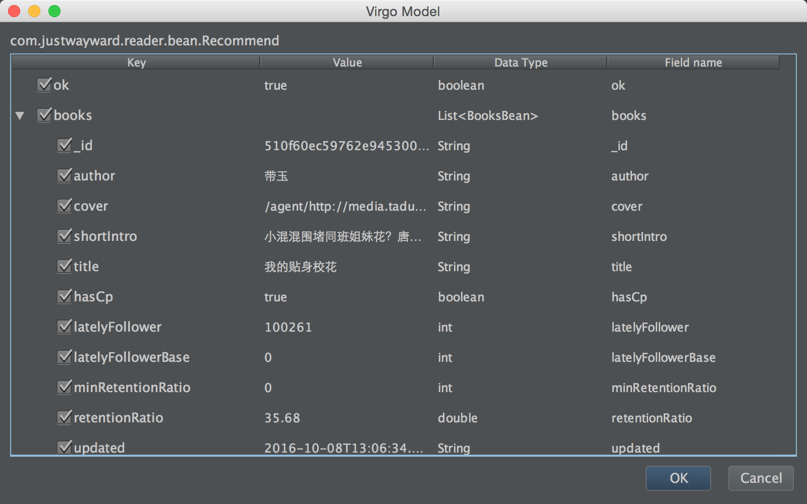 點擊OK,就可以生成一個實體類。有了請求URL和實體類,那麼封裝一個請求接口就不是啥難事啦~~