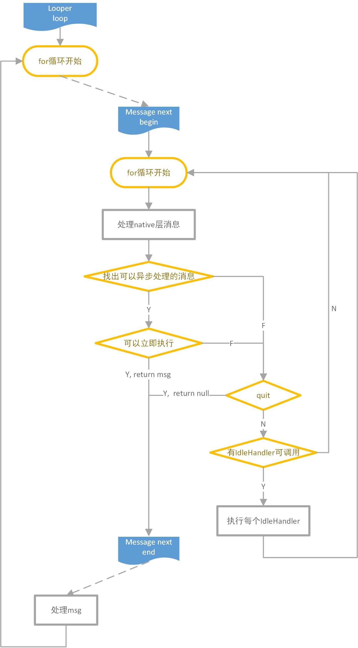 3.4、本次循環中,Native層事件處理完畢後,才開始處理Java層中MessageQueue的消息。若MessageQueue中沒有消息需要處理,並且MessageQueue中存在IdleHandler時,將調用IdleHandler定義的處理函數。