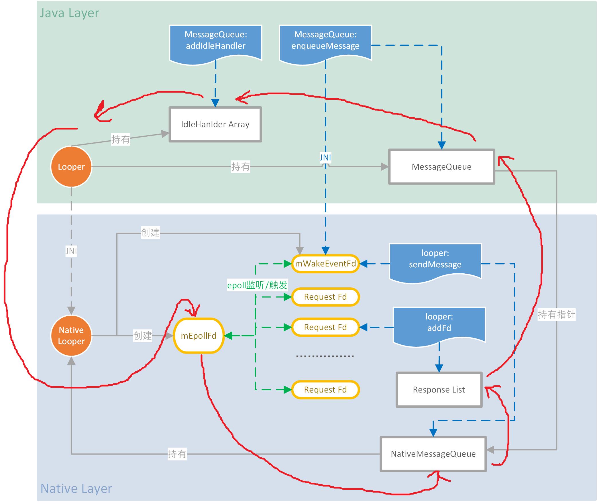 MessageQueue的整個流程包括了Java部分和Native部分,從圖中可以看出Native層的比重還是很大的。我們結合上圖回憶一下整個MessageQueue對應的處理流程: