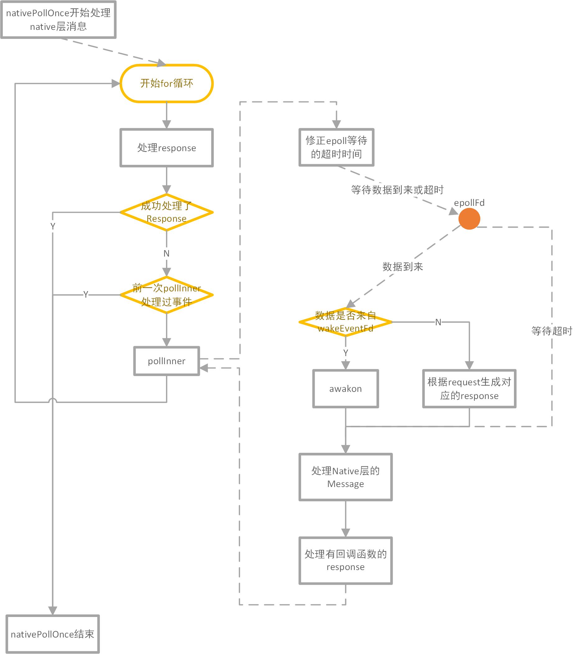 3.2、Native Looper開始運行後,需要等待epollFd被喚醒。當epollFd等待超時或監聽的句柄有事件到來,Native Looper就可以開始處理事件了。