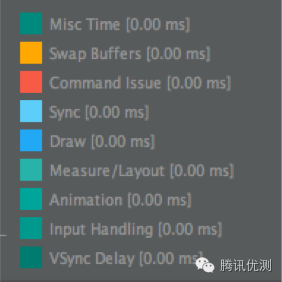 變成9種顏色,將渲染過程中的幾大步驟進一步細分,可以通過Android Studio上的GPU Monitor可以看到各顏色含義更新如下(關於GPU Monitor下一小節會具體介紹):