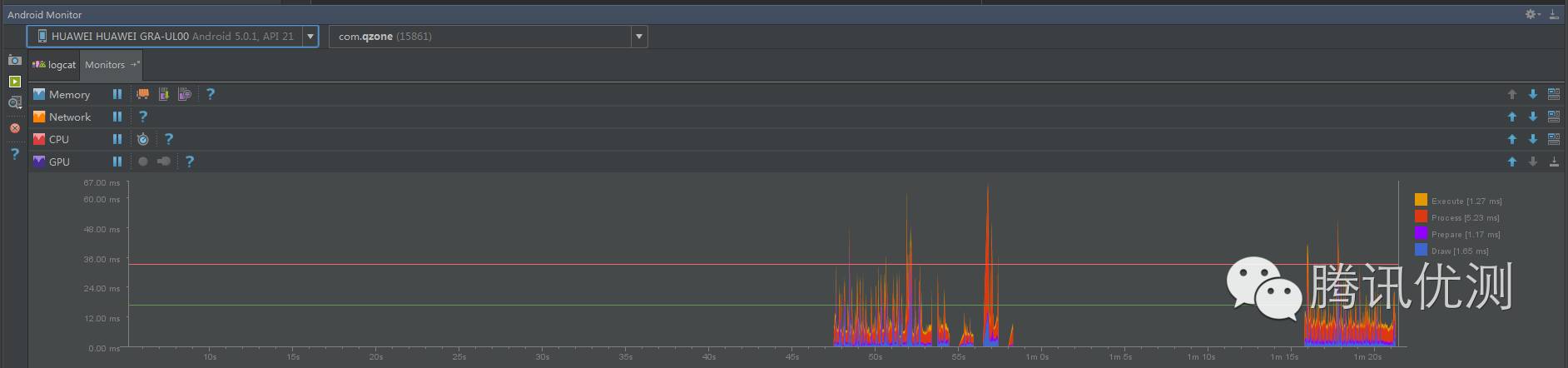 將手機連接電腦病開啟USB調試選項,打開Android Studio並點擊底部的“Android Monitor”,選擇待測的設備與進程,即可看到GPU Monitor的監控結果。以6.0系統為例,可以看到,GPU Monitor中呈現的信息實際上與GPU呈現模式分析中在手機屏幕上顯示的柱狀圖是相同的。