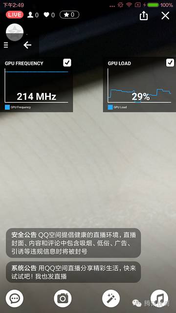 選擇“Profile App”即可選擇監測應用,在Setting中可以選擇監測項目,采樣頻率等高級選項,同時還可以選擇開啟懸浮窗口實時監測。我們選擇監測QQ空間直播過程中的GPU占用情況,並開啟懸浮窗口實時監測GPU狀態,如下圖:
