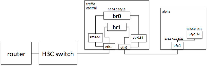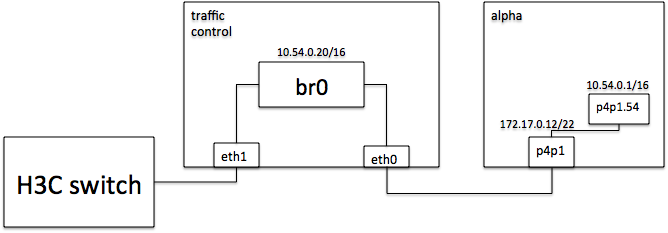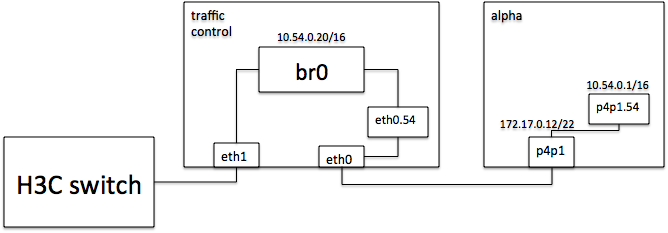 這時需要在10.54.0.20上把native通道打通,我們可以給每個vlan都創建一個bridge,用來給alpha服務器的各個Vlan提供相應的轉發通道,組網圖如下