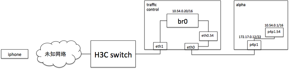 為了解決這個問題,我們在弱網絡服務器的eth0口上創建一個vlan54 device,然後再把eth0.54加到br0上,組網方式如下圖所示