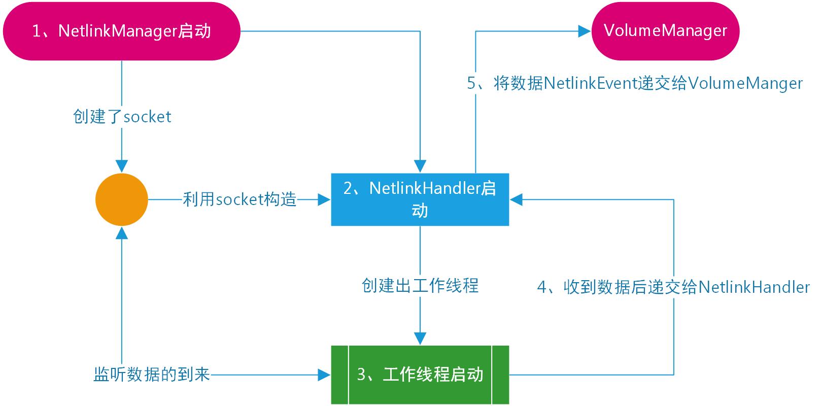 如上圖所示,Vold中的NetlinkManager模塊接收來自Linux Kernel的uevent消息。