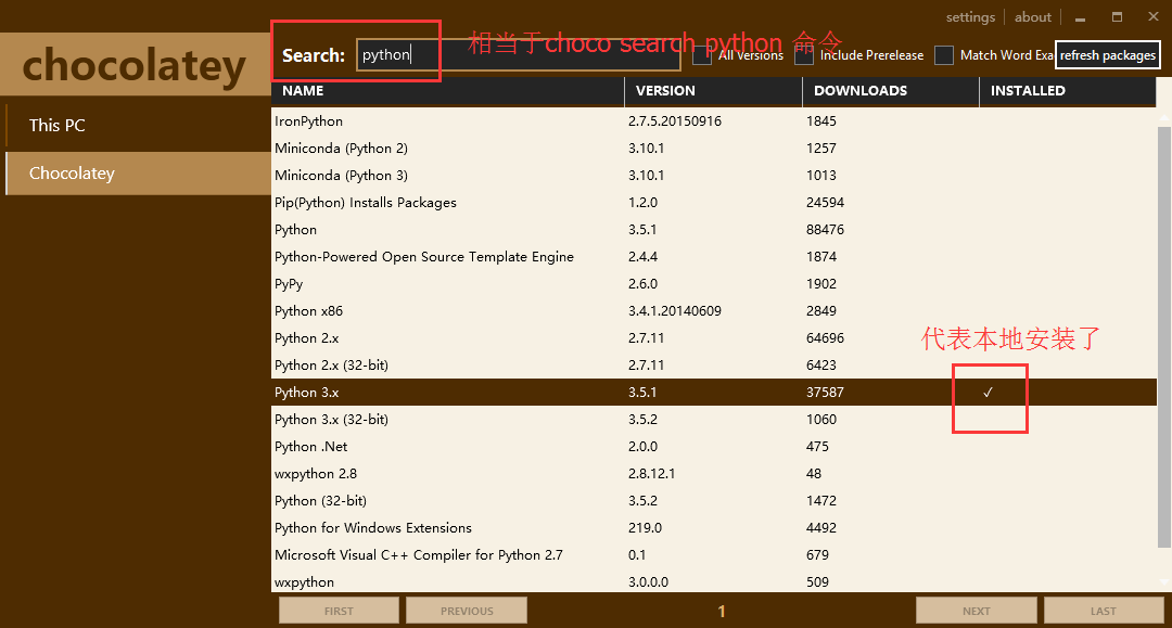 然後就會給出chocolatey官方網站返回的根據關鍵字python搜索的軟件列表,然後我們找到合適的版本即可,小編選擇安裝的是python3 3.5.1,所以