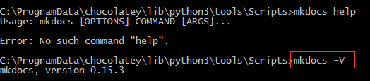 然後重新打開cmd,輸入mkdocs -V,如果顯示出來了版本,那麼恭喜你,終於安裝成功了!!!