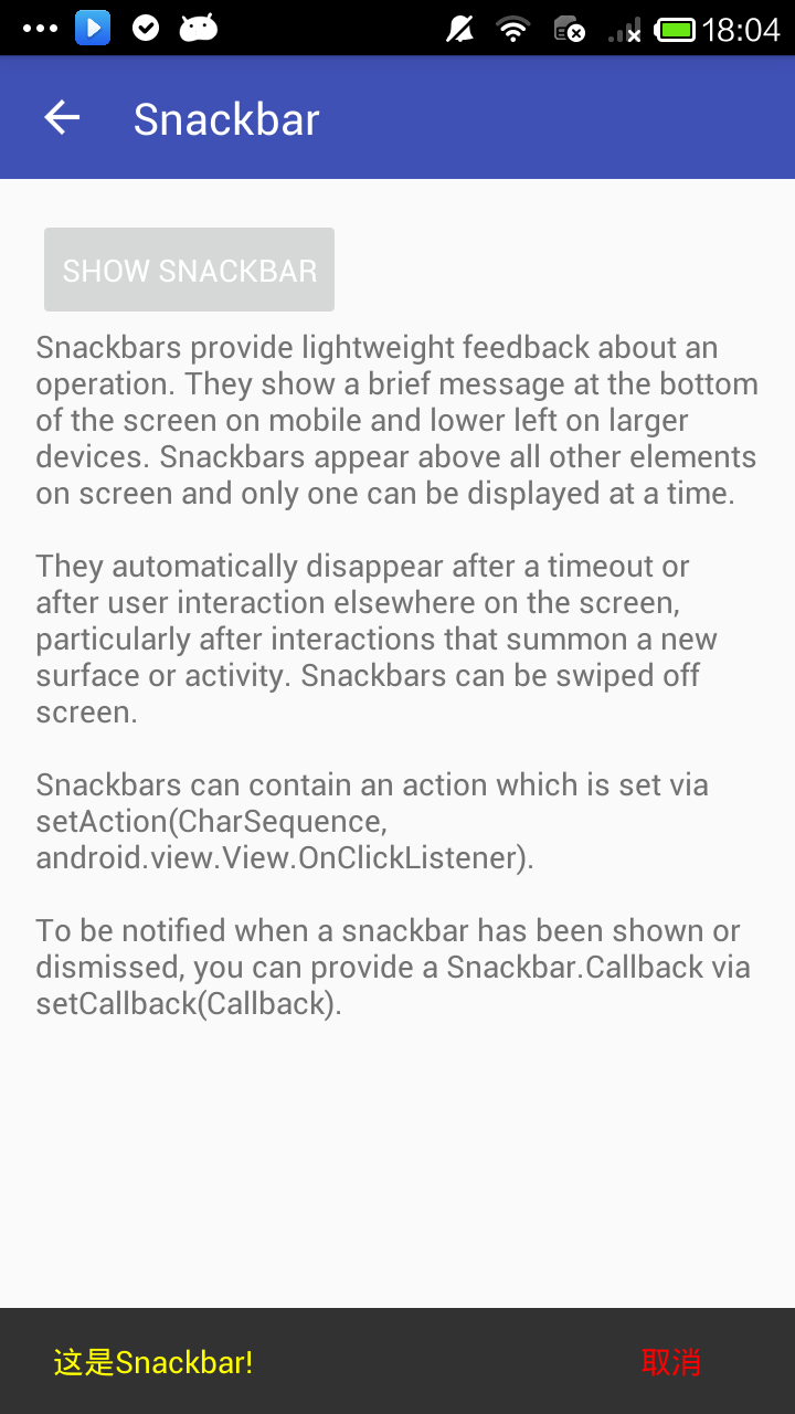 snackbar 提供了一個輕量級、快速反饋的操作。它顯示在屏幕的底部,而且包含一個可選的單獨的動作文本。在一定時間後會帶著動畫的方式自動從屏幕中消失。此外,也可以在時間到之前手動關閉它。