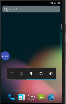 首先准備Looper,之後loop。因為更新view的時候會在當前的子線程中使用handler。而使用handler必須要looper。 接下來拿到windowManager wm = (WindowManager) MyApplication.ctx.getSystemService(WINDOW_SERVICE); 填充view WindowManager.LayoutParams.TYPE_SYSTEM_ERROR; 設置type,將window的級別設置較大,能夠顯示在其他的window之上 params.flags = WindowManager.LayoutParams.FLAG_NOT_FOCUSABLE | WindowManager.LayoutParams.FLAG_NOT_TOUCH_MODAL;這裡是設置window透傳,也就是當前view所在的window不阻礙底層的window獲得觸摸事件。 接下來設置window的寬度和高度 params.format = PixelFormat.TRANSPARENT;設置透明 否則的話 圓形view後面顯示一層黑色,默認效果是黑色。需要設置,才能體現出圓形。 接下來就是設置Gravity了,這裡比較簡單,因為想實現懸浮窗口的拖拽效果,因此需要修改WindowManager的LayoutParams的x,y值。因此需要和gravity配合使用 接下來就是將view添加到WindowManager中了 剩下的就是觸摸事件了 在松手的時候判斷了,更新了view中顯示的ui 下面是更新效果圖