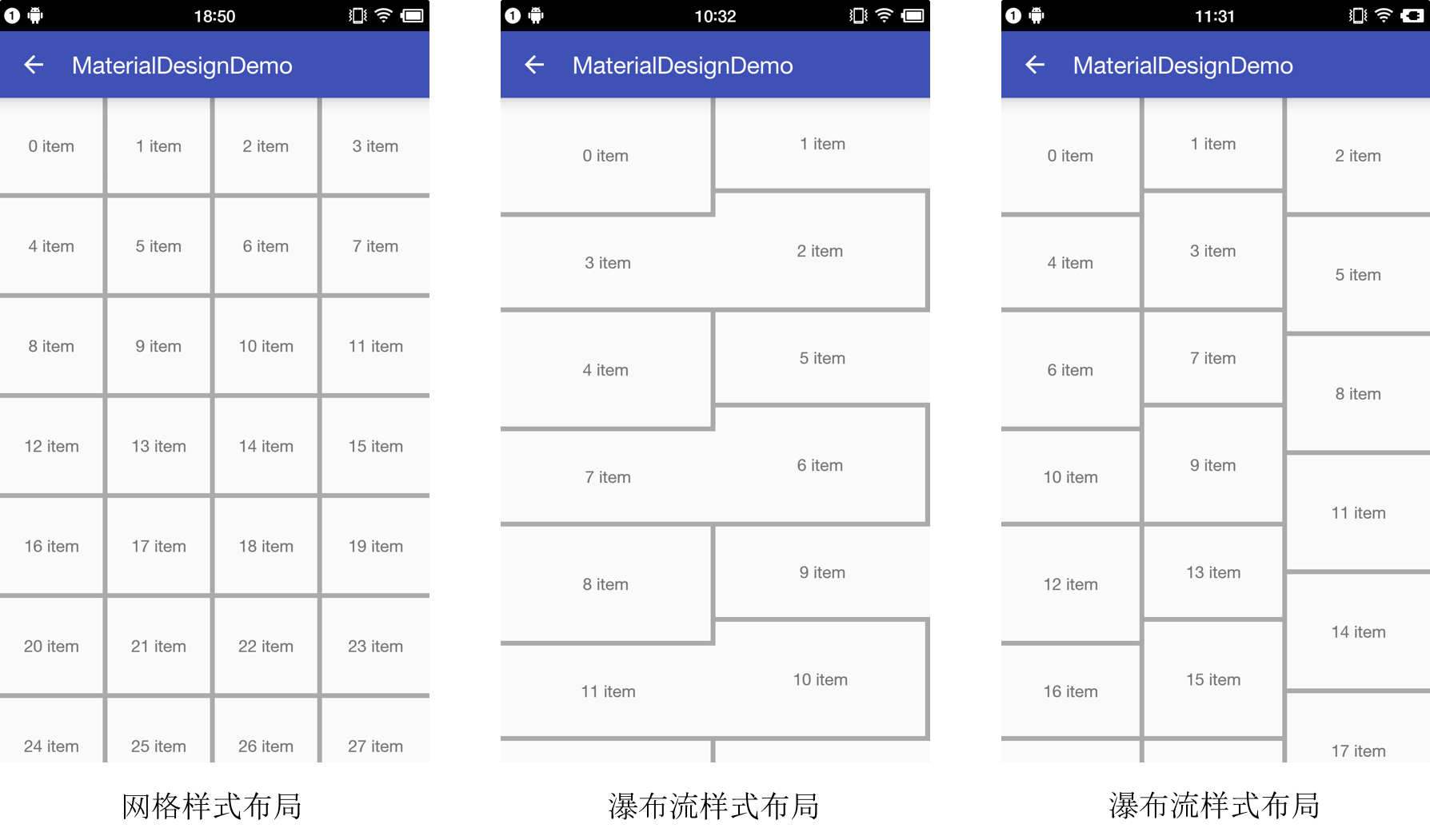 關於網格樣式和瀑布流樣式在本篇會仔細的介紹,細心的同學會發現,自定義間隔在上一篇文章中並沒有太過深入,只是介紹了方法的調用時機,但是關於更換間隔樣式沒有太詳細的介紹,是因為列表樣式的RecyclerView自定義間隔比較簡單,統一放到復雜一點的網格中來講解。直接進入主題,看看期待已久的網格模式和瀑布流模式的使用吧。