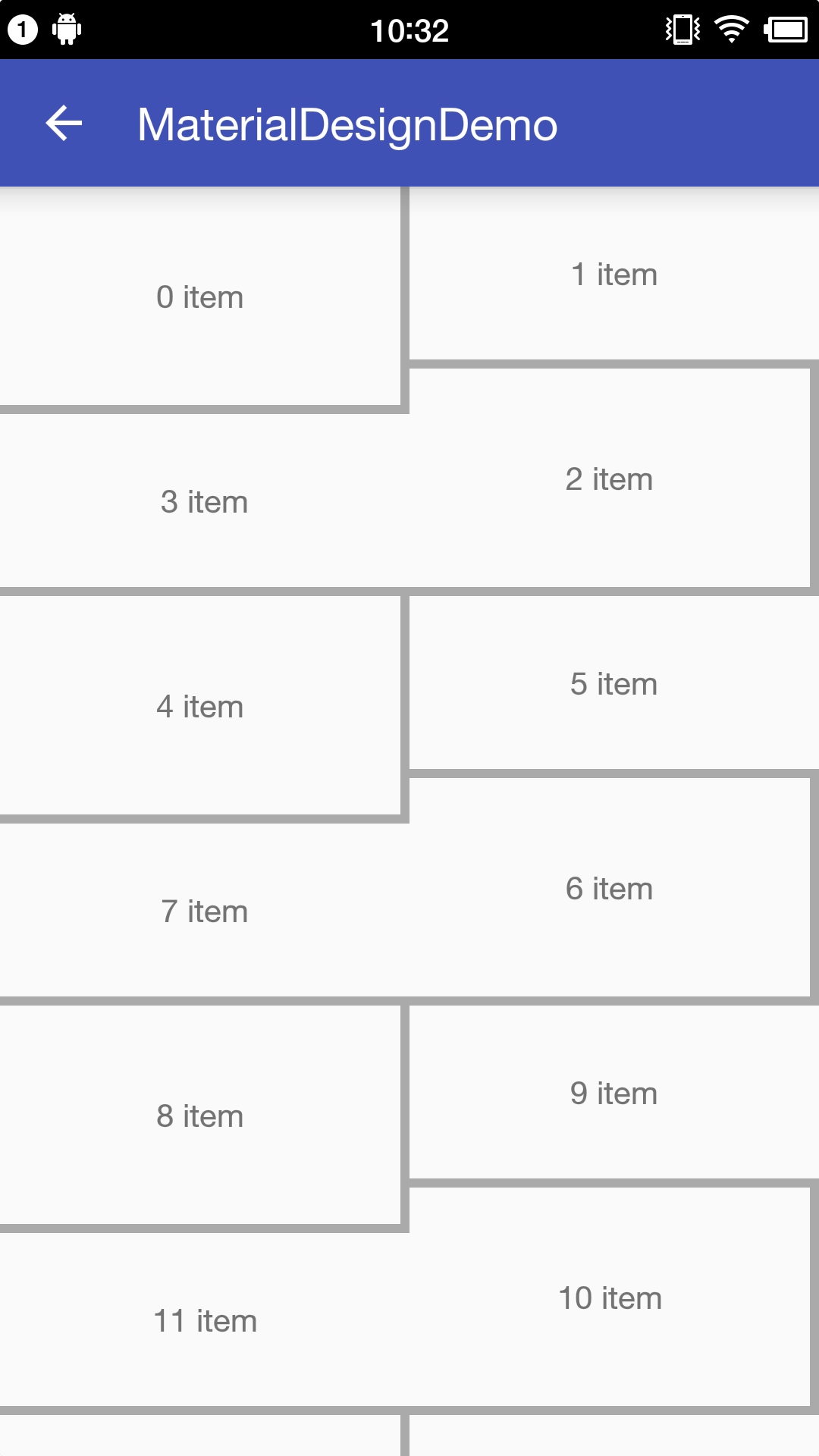 接下來是設置瀑布流樣式的間隔線樣式的,上面代碼中使用的是MDStaggeredRvDividerDecotation類,其實是直接拷貝的網格樣式的間隔線繪制類。看一下運行效果。