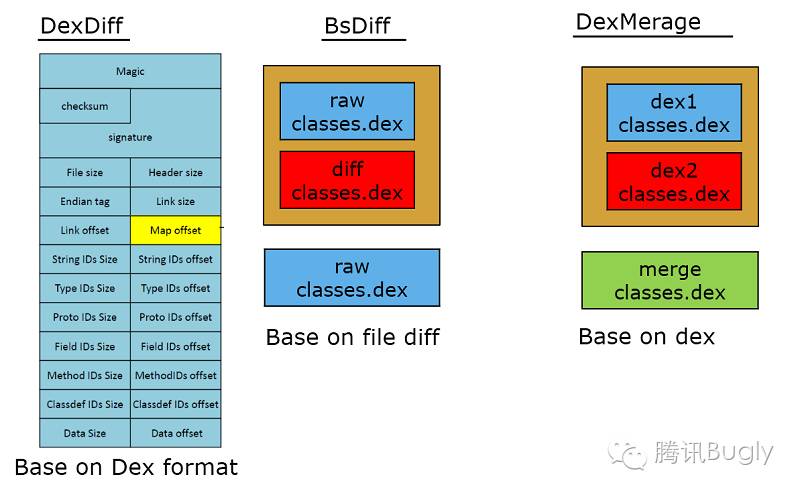 Tinker 的方案來源 gradle 編譯的 instant run 與 buck 編譯的 exopackage。它們的思想都是全量替換新的 Dex。即我們完全使用了新的 Dex,那樣既不出現 Art 地址錯亂的問題,在 Dalvik 也無須插樁。但是 instant run 針對的是編譯期,它可以直接將最後生成的所有變化都直接拷到手機端。對於線上方案,這肯定是不可行的。所以當前核心問題是找到合適的,使補丁結果更小的差分算法。