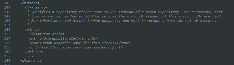天朝的網絡壁壘,我們常常無法訪問國外服務器,但是可以通過訪問鏡像達到目的,maven在天朝是有鏡像倉庫的,我們可以直接訪問國內鏡像倉庫,這樣訪問速度更快更穩定。那麼如何訪問國內鏡像倉庫呢?打開安裝目錄下的conf目錄,找到settting.xml配置文件,定位到如下圖位置