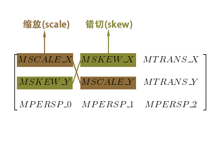 從上圖可以看到最後三個參數是控制透視的,這三個參數主要在3D效果中運用,通常為(0, 0, 1),不在本篇討論范圍內,暫不過多敘述,會在之後對文章中詳述其作用。