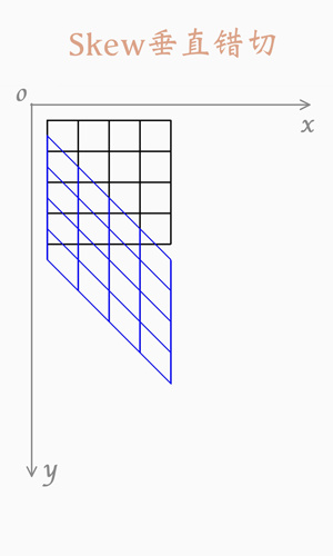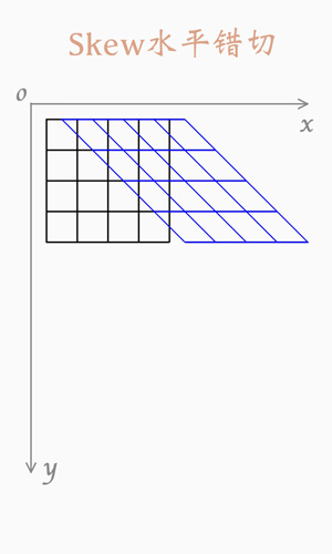 錯切存在兩種特殊錯切,水平錯切(平行X軸)和垂直錯切(平行Y軸)。