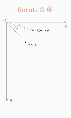 假定一個點 A(x0, y0) ,距離原點距離為 r, 與水平軸夾角為 α 度, 繞原點旋轉 θ 度, 旋轉後為點 B(x, y) 如下: