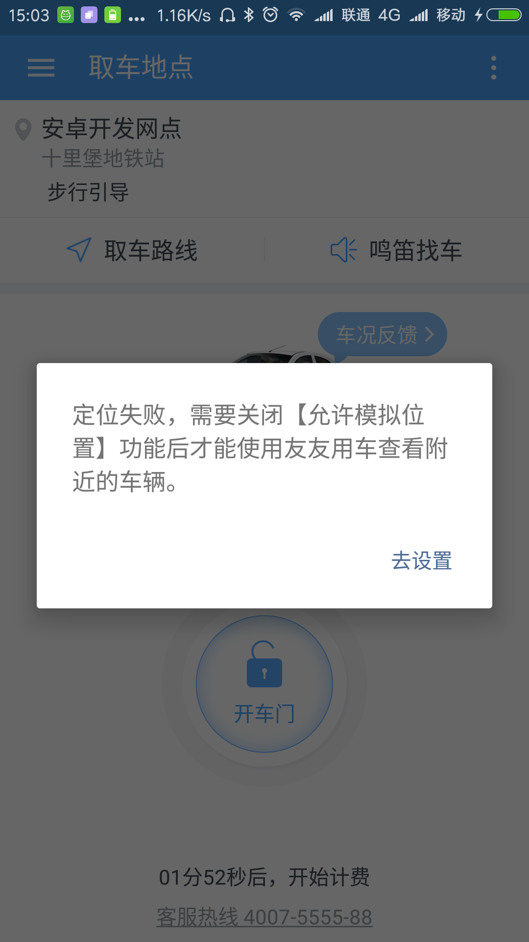 在我們的產品下單用車中有一個取車的環節,通過手機控制開車門,而這個時候會判斷當前手機是否打開的模擬位置的功能,若打開則,提示用戶並關閉該模擬位置的功能。(若是允許用戶打開模擬位置功能,則惡意用戶可以通過第三方的模擬位置App修改手機的定位信息,進而影響我們App的定位信息,當需要用戶在中關村還車時,在十裡堡就可以通過模擬位置屏蔽這個操作了)