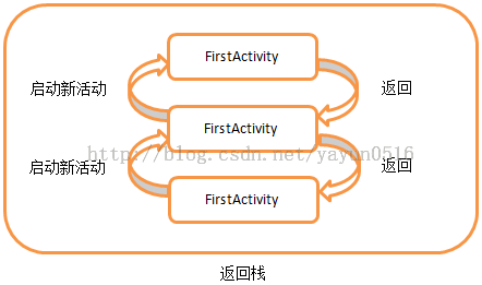 可以看出每點擊一次按鈕就產生一個新的活動,此時返回棧中有四個 MainActivity,連續按四次返回鍵才能退出程序。看一下模擬原理示意圖:
