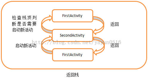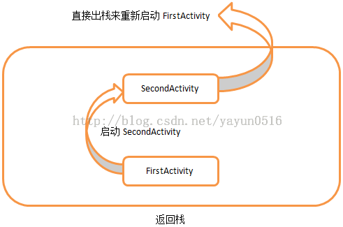 從打印信息中可以看出,在 SecondActivity 中啟動 MainActivity 時會發現棧中已經存在一個 MainActivity 實例了,並且在 SecondActivity 的下面,於是 SecondActivity 會從返回棧中出棧,而 MainActivity 重新成了棧頂活動,因此 MainActivity 的 onRestart() 方法和 SecondActivity 的 onDestroy() 方法得以執行。這時你只用點擊一次返回按鈕就能退出程序了。看一下原理示意圖: