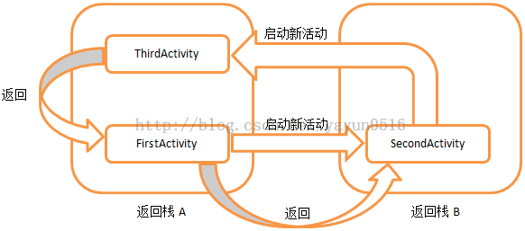 一共啟動了兩次 MainActivity,這時你按返回按鈕,應該先返回 SecondActivity,再按返回按鈕返回MainActivity,再按返回按鈕程序退出,看一下模擬原理示意圖: